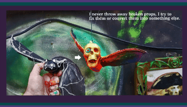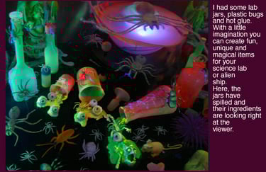 Look around your house and find any object or shape that may be converted into something spooky. I have a designated plastic crate. Every time I find an unusual jar, a piece of tech or cloth, anything with potential, it goes in the crate and is sorted through at the