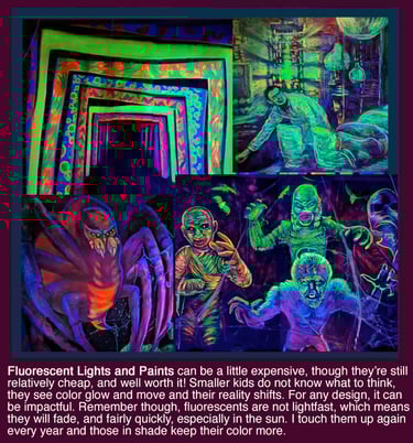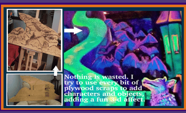 This is the inside walls of the side panels. I paint them solid black, then create a design in white, and then go over that with fluorescent paints, which can be seen best if you create in white and black first.