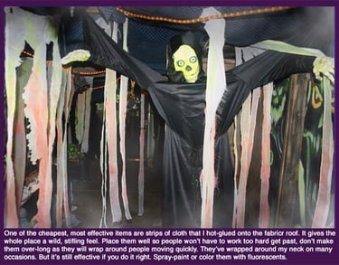 For the few dollars a bag of fake spider webs costs, they can completely alter the mood of the entire haunt. Get the ones that glow in the dark, or rather, under a black-light. It's one of the last things I do to my final design and man, it brings a punch. And it stops people from touching a lot of the items, or guides them to areas you want them to go.