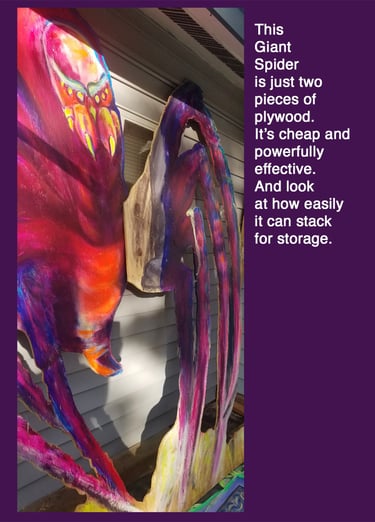 You can make your own giant spiders or buy a mix of sizes fairy cheap. Just think of all the crazy things you can do with a pool noodle! Or hangers and fabric, hoses, Just add fur, do your