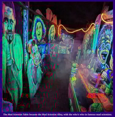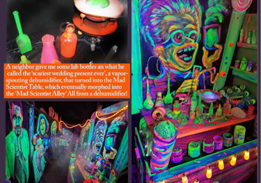 We threw some plastic bugs around it and it became the glowy alien dehumidifier area that eventually evolved into 'The Mad-Scientist's Table' came to life just from that one prop, and eventually morphed into the 'Mad-Scientist's Alley'.