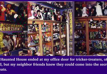 To top it off, I had accumulated an extensive collection of classic horror toys from the years of working horror cons, which my wife added to on every birthday or Christmas, or friends would find something in an attic or flea-market. For the first ten yrs, the Haunted House ended at my office, and neighbors could come in and tour the collection before I enclosed the space to build a bedroom.