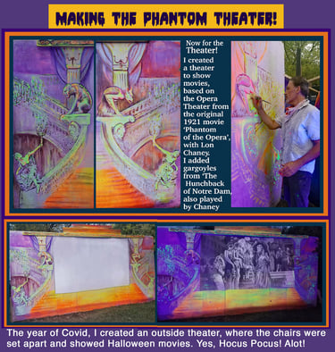 On the other side of the sidewalk I created a replica of Lon Chaney's Opera House in The Phantom of the Opera and this was born The Phantom Theater, where we played movies, with chairs spread apart. No one was allowed without a mask (we supplied them as well).